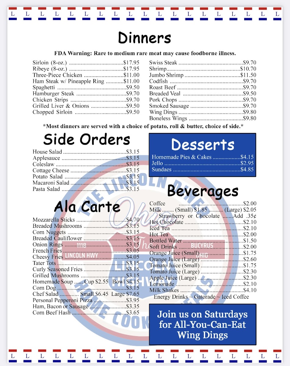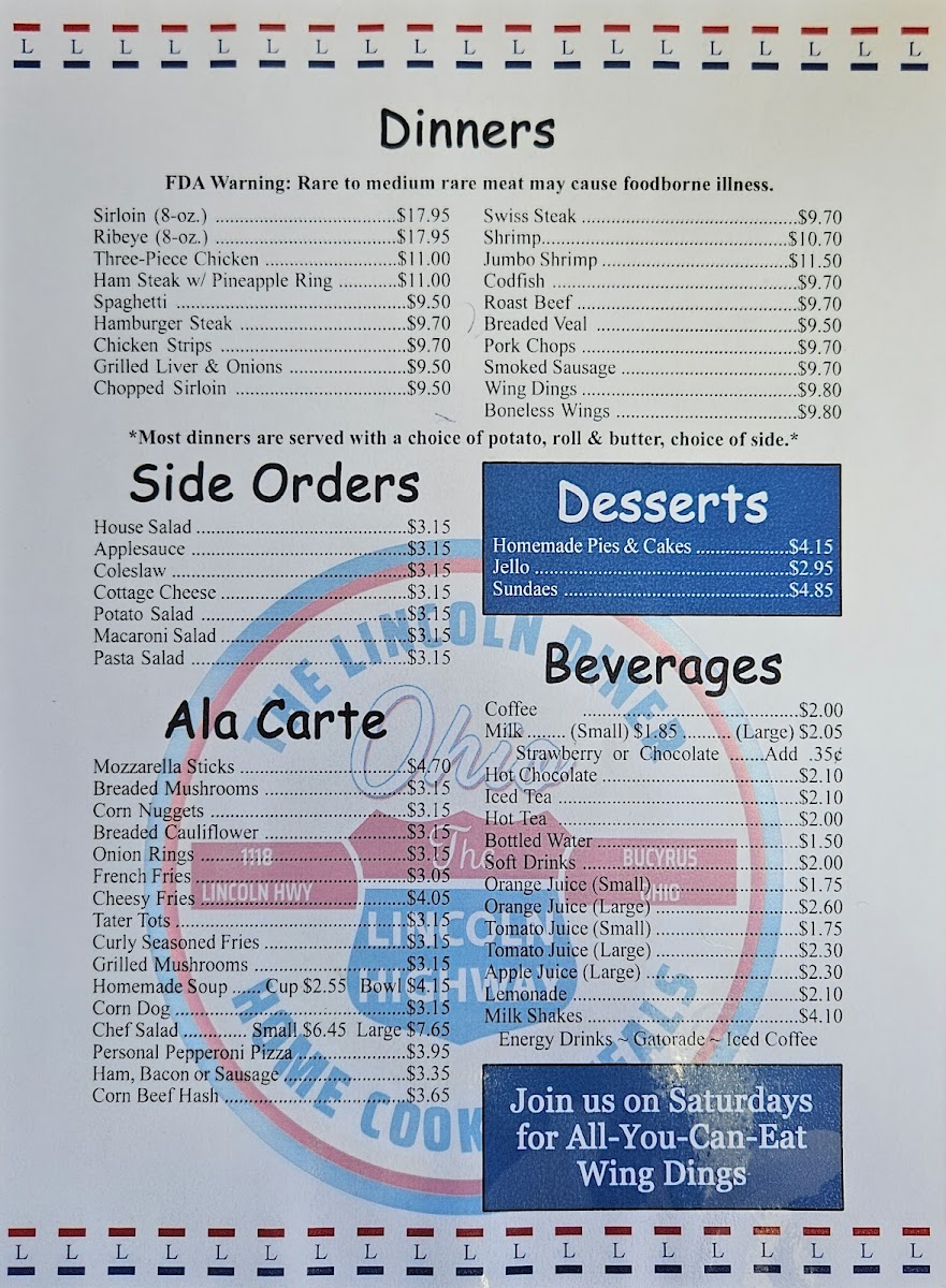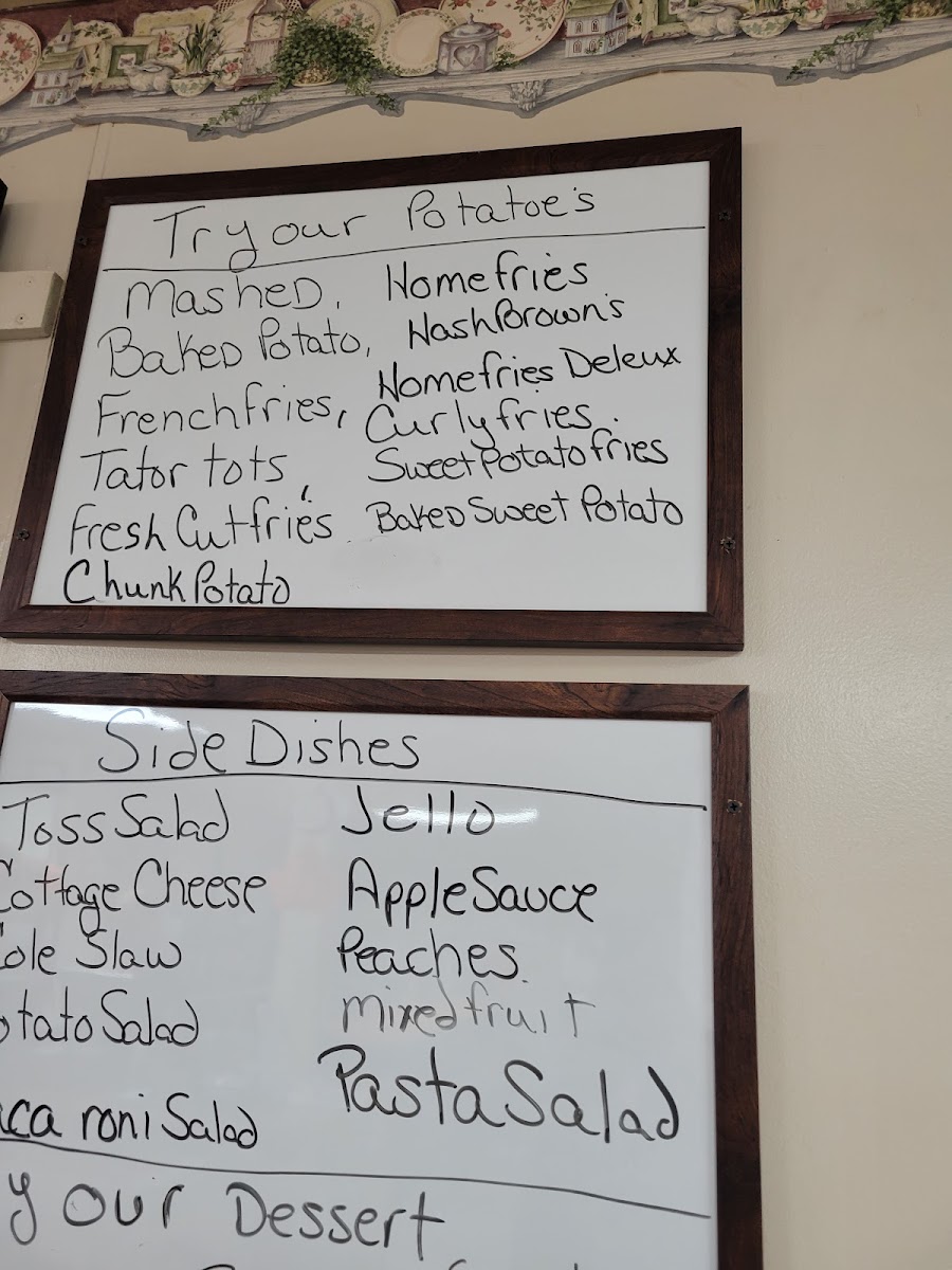 This menu is structured to accommodate casual dining with options suitable for breakfast, lunch, and dinner. It allows customers to select from lighter breakfasts, full dinner meals with sides, and desserts. The inclusion of all-you-can-eat offers and a range of sides supports flexible meal combinations.