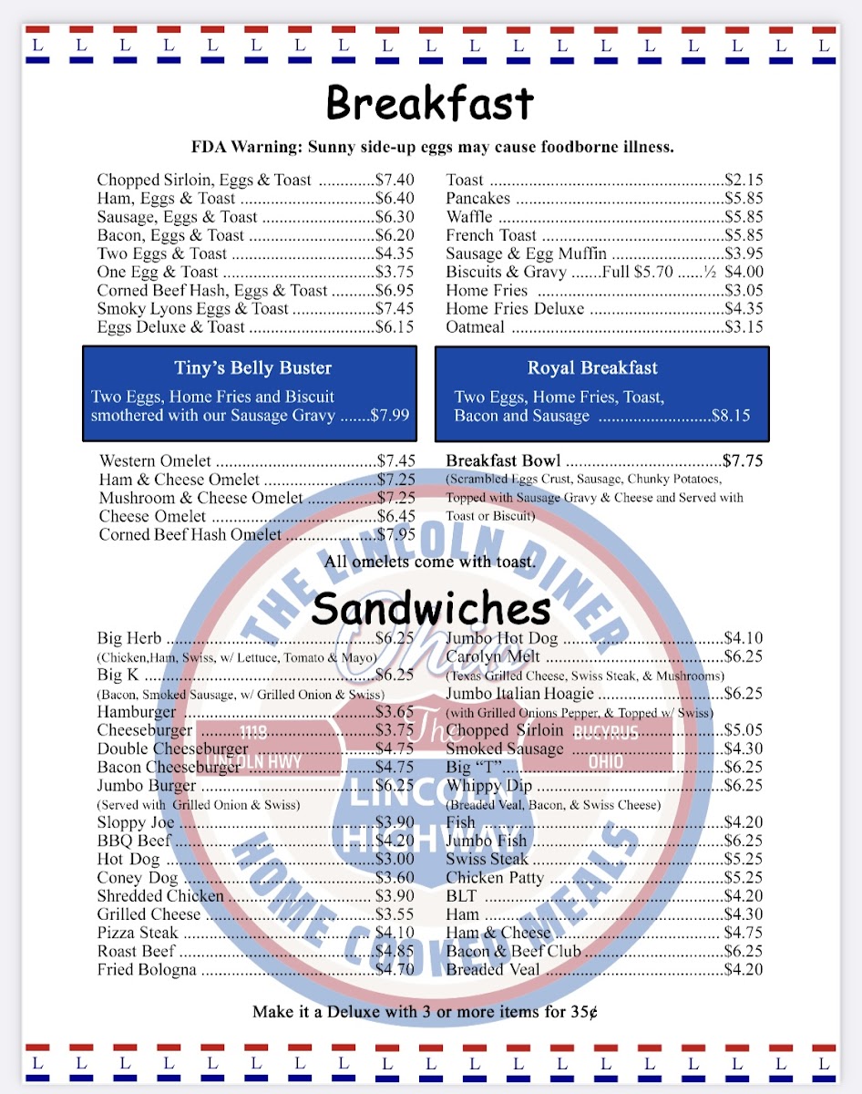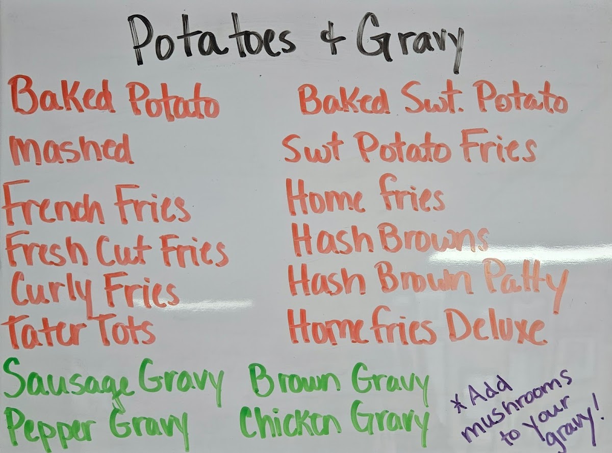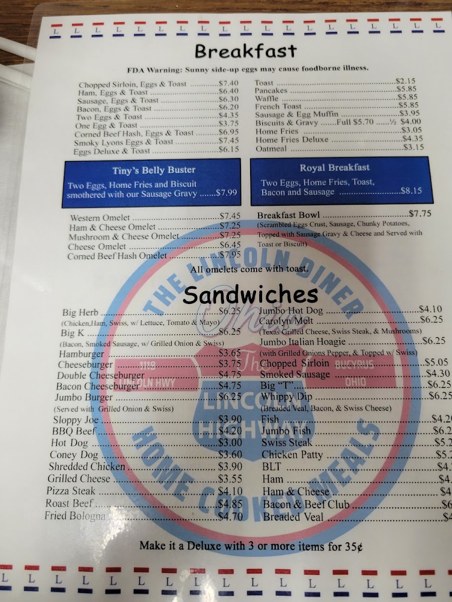 This menu is structured to accommodate casual dining with options suitable for breakfast, lunch, and dinner. It allows customers to select from lighter breakfasts, full dinner meals with sides, and desserts. The inclusion of all-you-can-eat offers and a range of sides supports flexible meal combinations.
